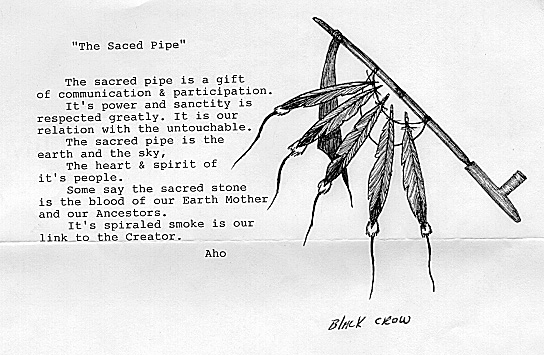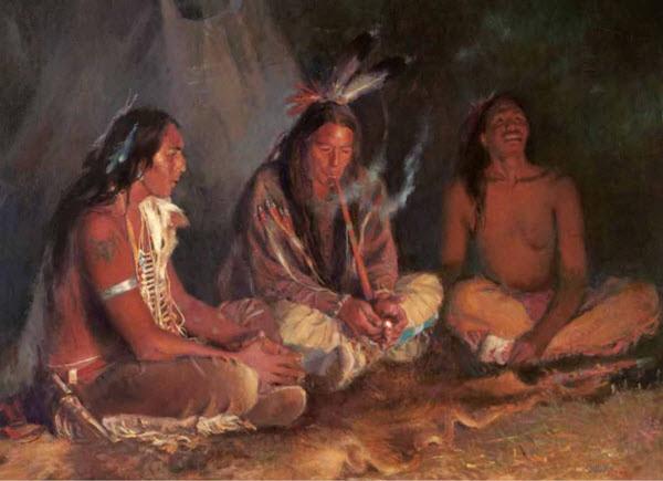 La cérémonie où l’on fume la pipe sacrée lie la terre, les humains et le ciel car la fumée emporte vers le Grand Esprit les pensées et les souhaits des membres présents à la cérémonie.