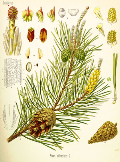 - Pinus sylvestris appartient à une famille de conifères à feuilles persistantes qui comprend environ 90 espèces qui poussent dans les régions tempérées de l’hémisphère nord. Ce pin pousse à une hauteur de 30 mètres ou plus dans les forêts du nord de l’Europe et est originaire de l’Europe occidentale à la Sibérie. Il a une couronne plate et une écorce brun rougeâtre profondément fissurée, des feuilles gris-vert en forme d’aiguille qui poussent par paires, des fleurs jaune orangé et des cônes bruns pointus. Le pin est en feuilles toute l’année, fleurit en mai et les graines mûrissent de mars à juin.
